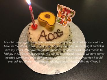 “Acas, my pride my prince! Happy Birthday in heaven sweet boy! Papa believes that you get all of the wonderful things that you’d like in heaven so there will be an abundance of birthday cake, treats, and toys to celebrate with your friends. Acas, papa decided to donate the money I would had spent for your birthday to other dogs that probably never had birthday celebration for their whole life. Papa is thinking about you and wishes you a VERY Happy Birthday! I love you sweet boy! XOXO”, papa.